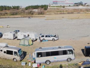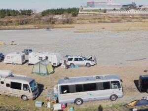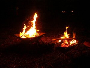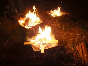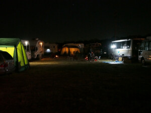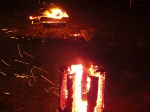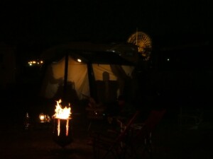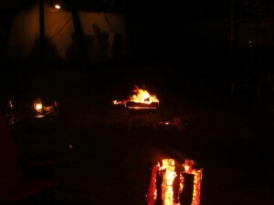 真夜中0時に到着しました。到着組は寝ているかと思ったら、焚火の周りで酒宴が続いていました。
